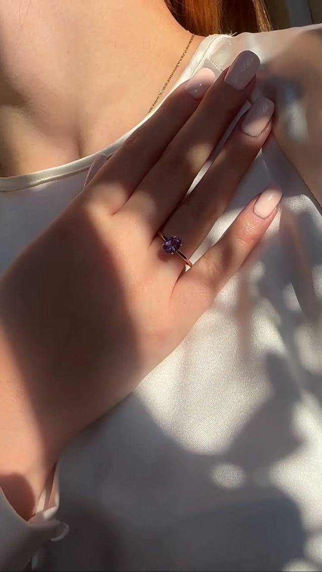 Este anillo solitario fusiona la calidez romántica del oro rosa de 14k con el toque femenino de una amatista corte oval, una forma elegida no solo por su brillo, sino por su capacidad para estilizar y alargar visualmente la mano de quien lo porta. Es una pieza delicada y soñadora, perfecta para sellar una promesa especial o para celebrar tu propia feminidad con una gema que inspira paz y equilibrio.
